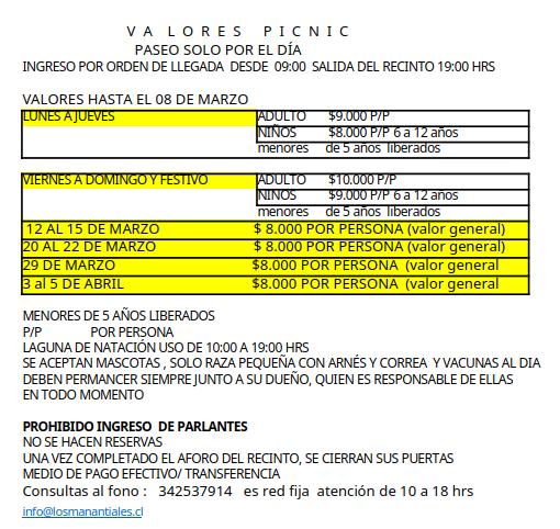 Valor picnic ( solo paseo por el día) $8.000 por persona  (desde los 6 años)